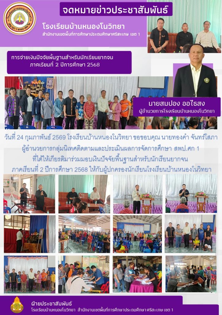 วันที่ 24 กุมภาพันธ์ 2569 โรงเรียนบ้านหนองโนวิทยา ขอขอบคุณ นายทองคำ จันทร์โสภา