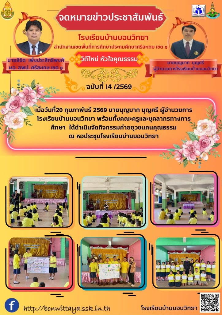เมื่อวันที่20 กุมภาพันธ์ 2569 นายบุญมาก บุญศรี ผู้อำนวยการโรงเรียนบ้านบอนวิทยา พร้อมทั้งคณะครูและบุคลากรทางการศึกษา ได้ดำเนินจัดกิจกรรมค่ายยุวชนคนคุณธรรม ณ หอประชุมโรงเรียนบ่านบอนวิทยา
