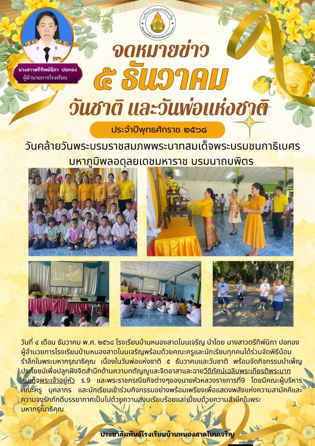 พิธีและกิจกรรมเนื่องในวันคล้ายวันพระราชสมภพระบาทสมเด็จพระบรมชนกาธิเบศรมหาภูมิพลอดุลยเดชมหาราช บรมนาถบพิตร วันชาติ และวันพ่อแห่งชาติ 5 ธันวาคม 2564 และมอบทุนให้กับนักเรียน เรียนดี ประพฤติดี นำเสนอเมื่อ 13 ธ.ค.64 อ่านแล้ว: 38 ครั้ง