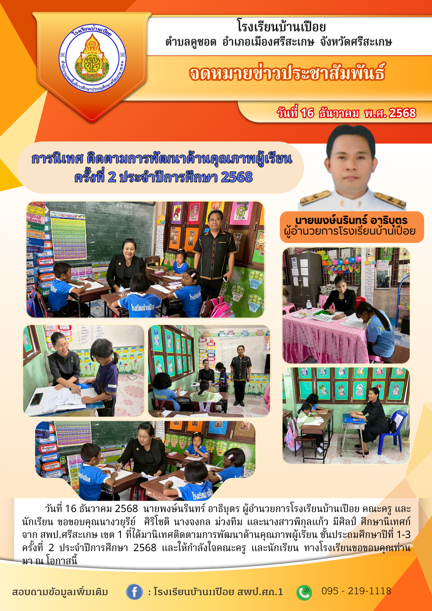 โรงเรียนบ้านโพนยาง ขอขอบพระคุณคณะกรรมการนิเทศตามโครงการ นิเทศ ติดตาม สืบสาน การสะท้อนบทเรียน เปลี่ยนนักเรียน ครู เป็นผู้ร่วมทางร่วมสร้างโรงเรียนคุณภาพตามวิสัยทัศน์”คุณธรรม คุณภาพ เป็นเลิศ”เต็มที่ด้วยกระบวนการนิเทศดี ๆ ที่ศรีสะเกษ เขต 1 นำเสนอเมื่อ 23 ธ.ค.64 อ่านแล้ว: 17 ครั้ง