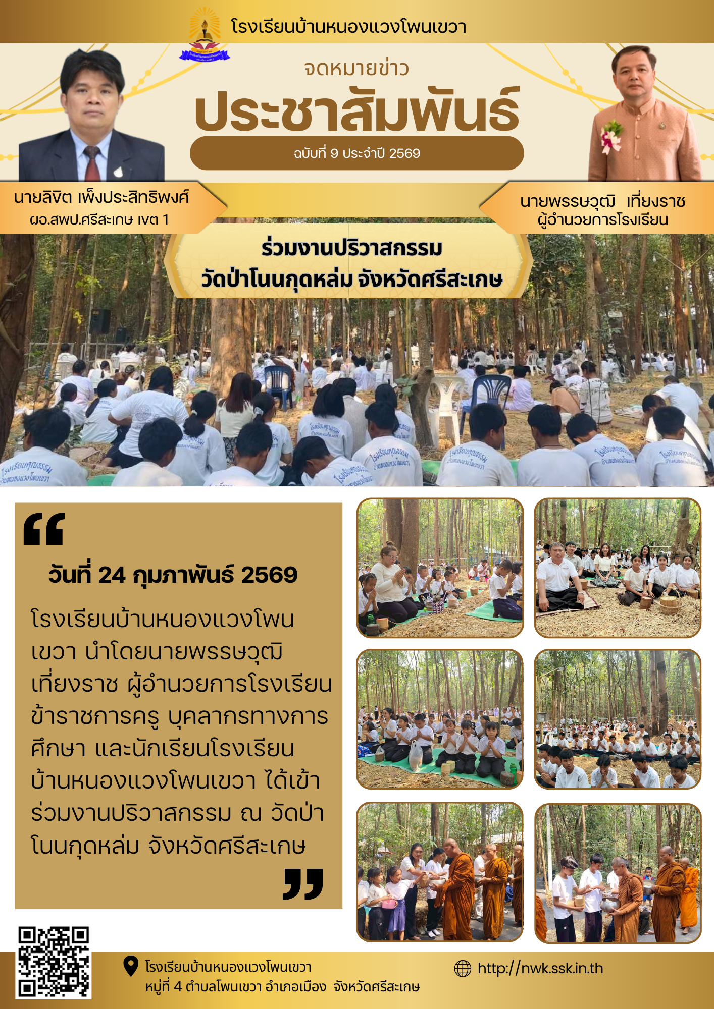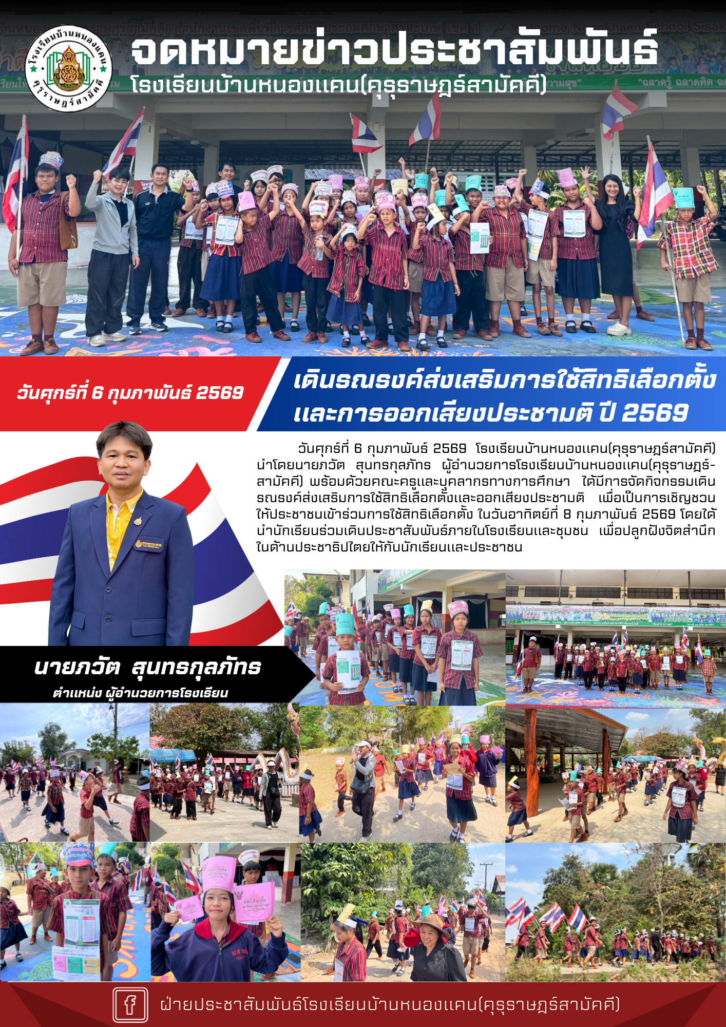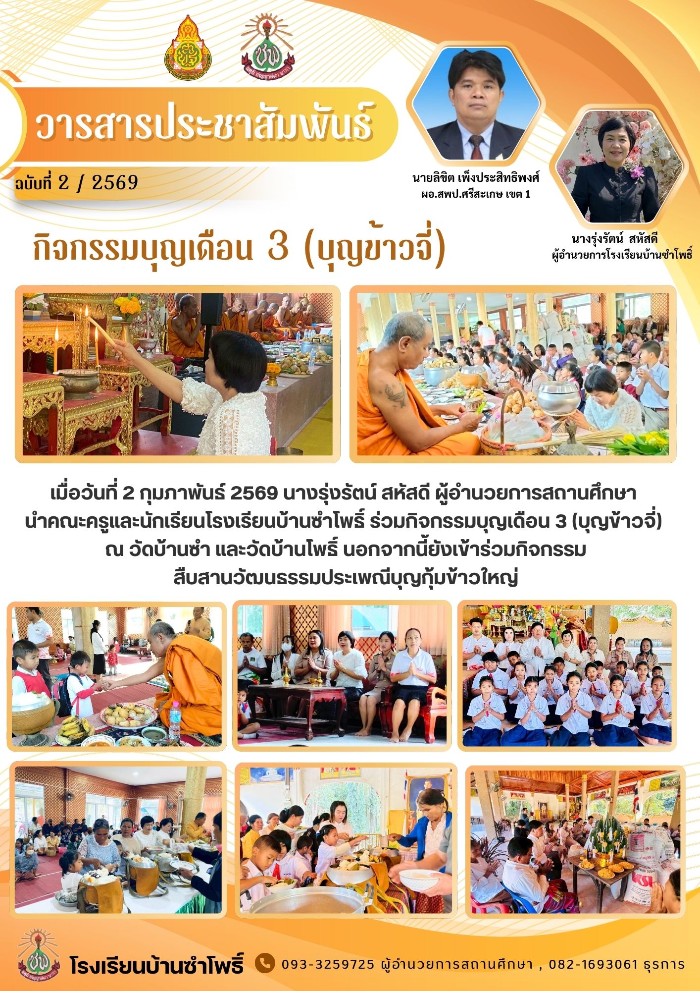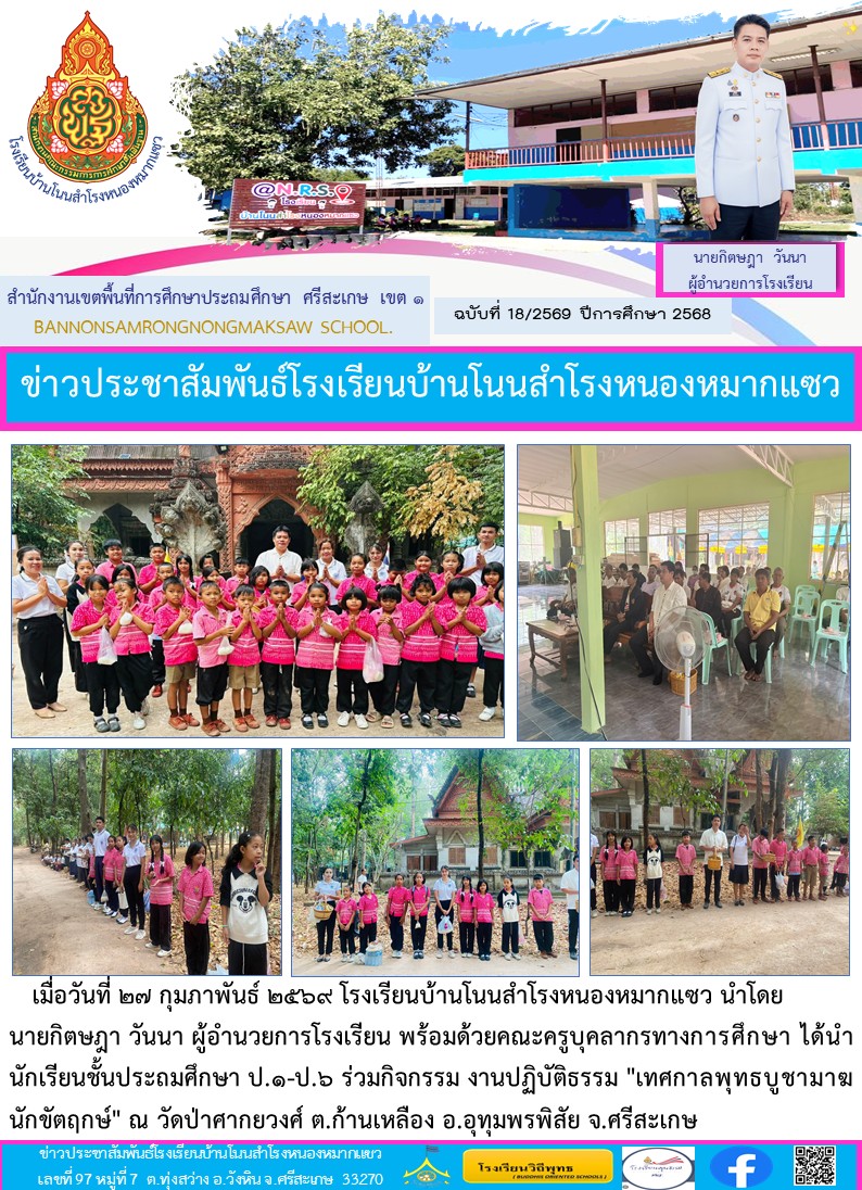 โรงเรียนบ้านหนองแคน(คุรุราษฎร์สามัคคี) นำโดยนายภวัต สุนทรกุลภัทร และคณะครู ได้จัดกิจกรรมตักบาตรข้าวสารอาหารแห้งและนำนักเรียนทำบุญเนื่องในวันมาฆบูชา ณ วัดบ้านหนองแคน นำเสนอเมื่อ 3 มี.ค.69 อ่านแล้ว: 8 ครั้ง
