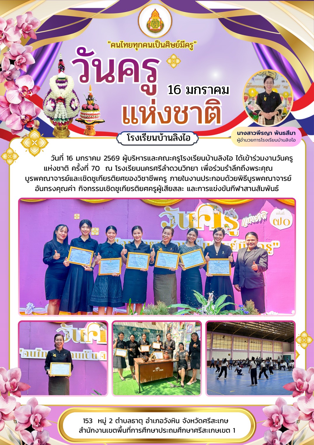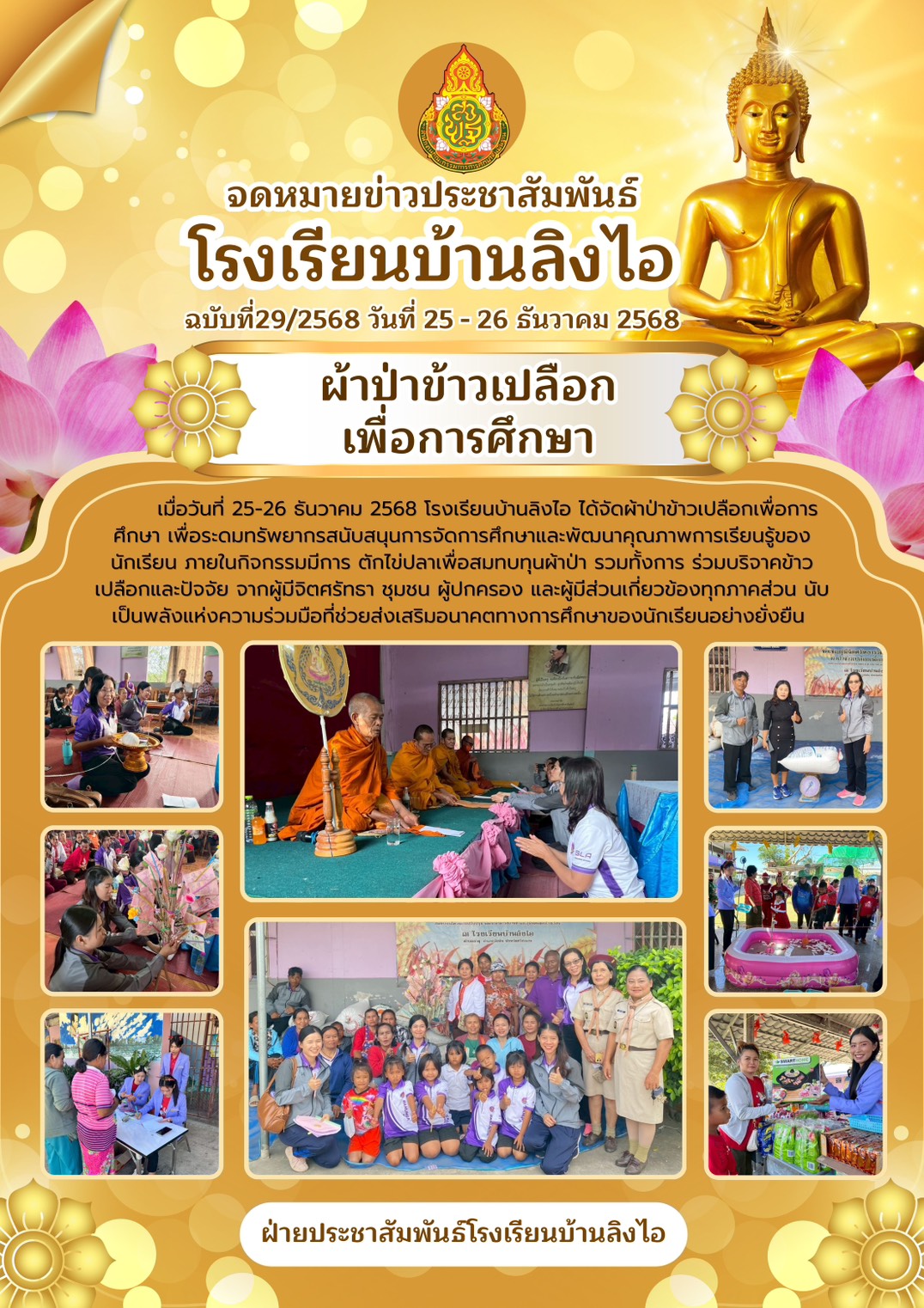 วันจันทร์ที่ 2 มีนาคม 2569 นำโดยนางสาวพีรญา พันธสีมา ผู้อำนวยการโรงเรียนบ้านลิงไอ และคณะครู นำนักเรียนเข้าวัดทำบุญเนื่องในวันมาฆบูชาประกอบด้วยกิจกรรม สวดมนต์ไหว้พระ เวียนเทียนและบำเพ็ญประโยชน์ ณ วัดสุวรรณาราม(วัดบ้านลิงไอ) เพื่อเป็นกิจกรรมสืบสานประเพณีทางพระพุทธศาสนาที่พุทธศาสนิกชนถือปฏิบัติในวันสำคัญทางพระพุทธศาสนา เพื่อได้เรียนรู้เกี่ยวกับหลักธรรมของศาสนาพุทธและฝึกปฏิบัติด้วยตนเองรวมทั้งปลูกฝังให้นักเรียนรู้จักการมีจิตอาสา การบำเพ็ญประโยชน์ต่อส่วนรวม นำเสนอเมื่อ 2 มี.ค.69 อ่านแล้ว: 4 ครั้ง