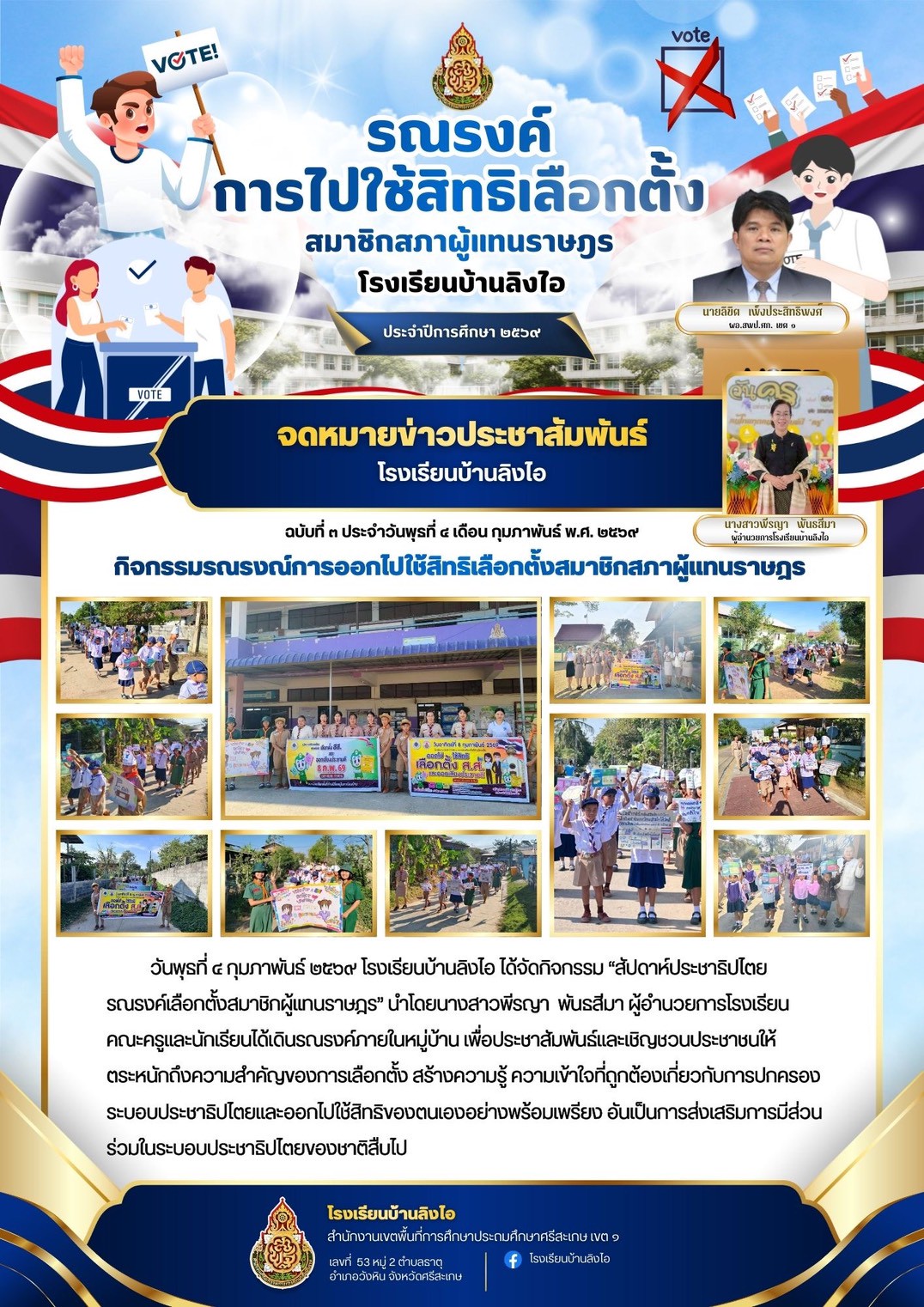 กิจกรรมเข้าค่ายลูกเสือ-เนตรนารี สะบายดีแคมป์ โรงเรียนบ้านลิงไอเข้าค่ายลูกเสือ–เนตรนารี ประจำปีการศึกษา 2568 ณ “สะบายดีแคมป์” ระหว่างวันที่ 26–27 กุมภาพันธ์ 2569 เพื่อส่งเสริมทักษะชีวิต ความมีระเบียบวินัย ความอดทน และการทำงานเป็นทีมของนักเรียน ภายในค่ายมีกิจกรรมนันทนาการ ผจญภัยตามฐานต่างๆ รอบกองไฟ และร่วม ปิดกอง กิจกรรมครั้งนี้เต็มไปด้วยประสบการณ์การเรียนรู้นอกห้องเรียนที่มีคุณค่า นำเสนอเมื่อ 2 มี.ค.69 อ่านแล้ว: 4 ครั้ง