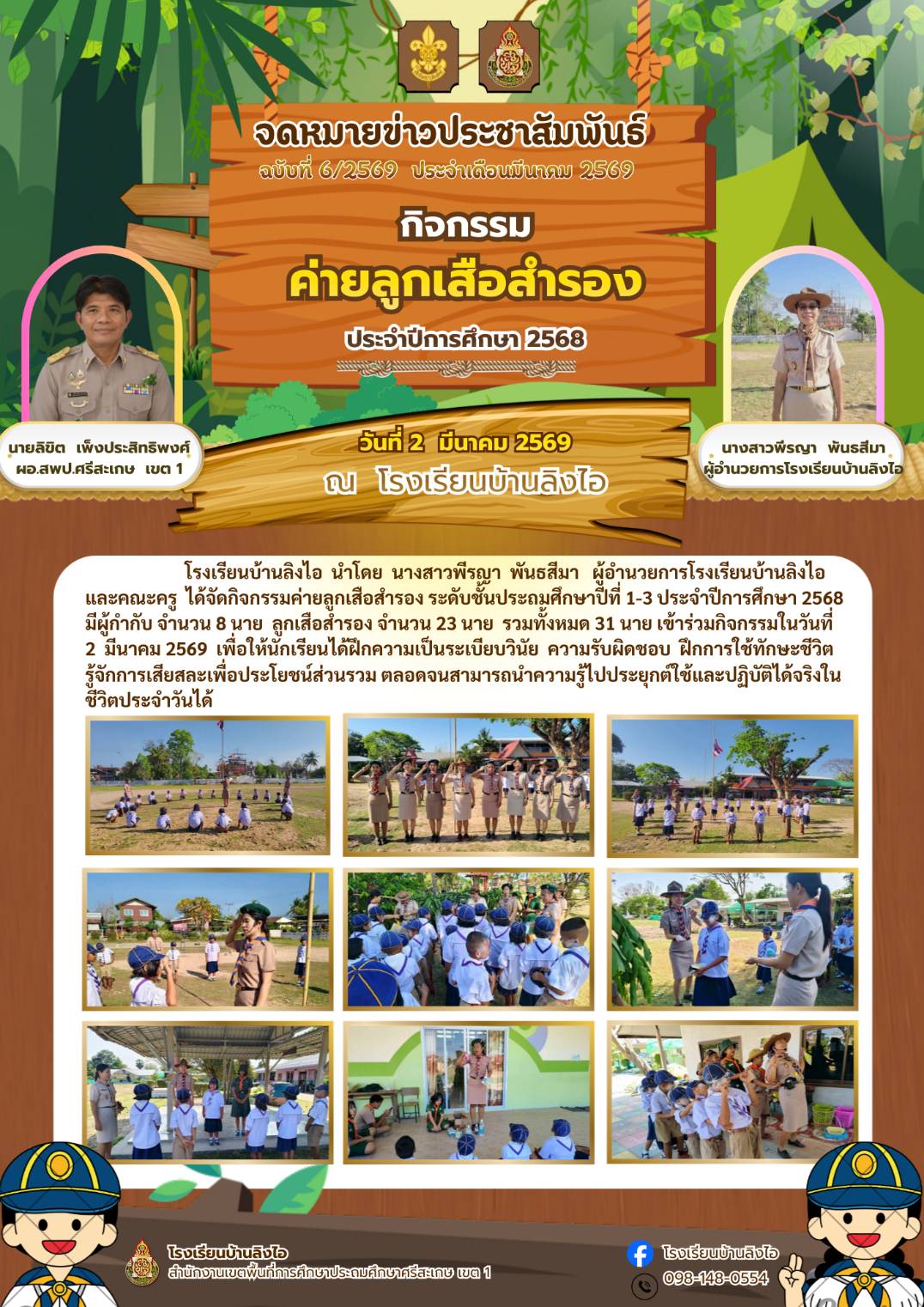 โรงเรียนบ้านลิงไอ นำโดย นางสาวพีรญา พันธสีมา ผู้อำนวยการโรงเรียนบ้านลิงไอ และคณะครู ได้จัดกิจกรรมค่ายลูกเสือสำรอง ระดับชั้นประถมศึกษาปีที่ 1-3 ประจำปีการศึกษา 2568 มีผู้กำกับ จำนวน 8 นาย ลูกเสือสำรอง จำนวน 23 นาย รวมทั้งหมด 31 นาย เข้าร่วมกิจกรรมในวันที่ 2 มีนาคม 2569 เพื่อให้นักเรียนได้ฝึกความเป็นระเบียบวินัย ความรับผิดชอบ ฝึกการใช้ทักษะชีวิต รู้จักการเสียสละเพื่อประโยชน์ส่วนรวม ตลอดจนสามารถนำความรู้ไปประยุกต์ใช้และปฏิบัติได้จริงในชีวิตประจำวันได้ นำเสนอเมื่อ 3 มี.ค.69 อ่านแล้ว: 3 ครั้ง