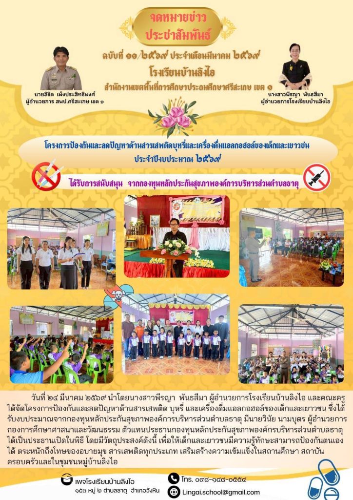 วันที่ ๒๔ มีนาคม ๒๕๖๙ นำโดยนางสาวพีรญา พันธสีมา ผู้อำนวยการโรงเรียนบ้านลิงไอ และคณะครู ได้จัดโครงการป้องกันและลดปัญหาด้านสารเสพติด บุหรี่ และเครื่องดื่มแอลกอฮอล์ของเด็กและเยาวชน ซึ่งได้รับงบประมาณจากกองทุนหลักประกันสุขภาพองค์การบริหารส่วนตำบลธาตุ มีนายวินัย นามบุตร ผู้อำนวยการกองการศึกษาศาสนาและวัฒนธรรม ตัวแทนประธานกองทุนหลักประกันสุขภาพองค์กรบริหารส่วนตำบลธาตุได้เป็นประธานเปิดในพิธี โดยมีวัตถุประสงค์ดังนี้ เพื่อให้เด็กและเยาวชนมีความรู้ทักษะสามารถป้องกันตนเองได้ ตระหนักถึงโทษของอบายมุข สารเสพติดทุกประเภท เสริมสร้างความเข้มแข็งในสถานศึกษา สถาบันครอบครัวและในชุมชนหมู่บ้านลิงไอ